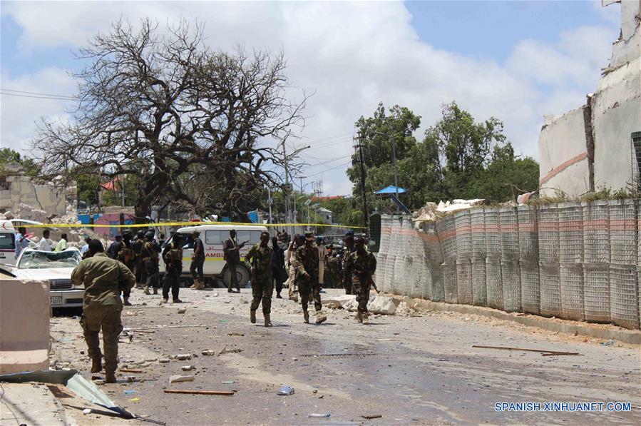 Miembros de seguridad se reúnen en el lugar de la explosión, en Mogadiscio, capital de Somalia, el 30 de agosto de 2016. Al menos dos personas murieron y varias más resultaron heridas el martes en una explosión cerca del SYL Hotel, el cual está muy próximo al palacio presidencial de Mogadiscio, capital de Somalia, informó la policía. (Xinhua/Faisal Isse)