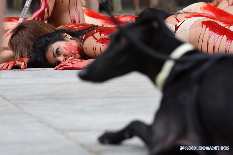 MADRID, agosto 30, 2016 (Xinhua) -- Activistas en favor de los derechos de los animales cubiertos con pintura roja participan durante una protesta contra el comercio de pieles, en Madrid, capital de Espa?a, el 30 de agosto de 2016. (Xinhua/Jorge Sanz/Pacific Press/ZUMAPRESS)