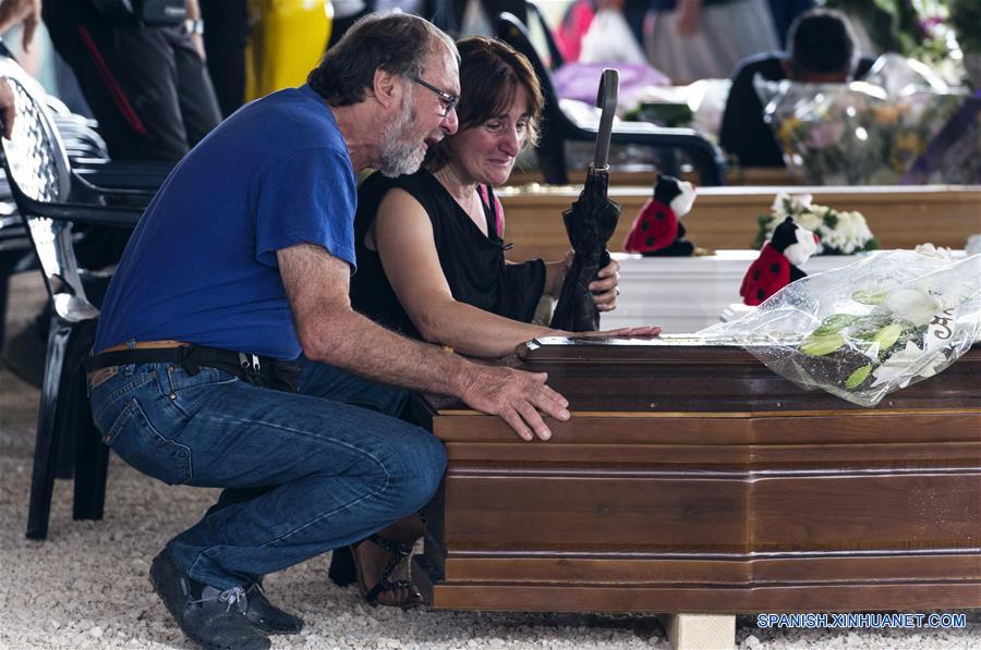 Personas reaccionan durante el funeral de algunas de las víctimas del sismo, en Amatrice, Italia, el 30 de agosto de 2016. Los funerales de las víctimas del sismo del miércoles pasado en Amatrice fueron llevados a cabo el martes en su villa de Lazio. (Xinhua/Fabrizio Di Nucci)