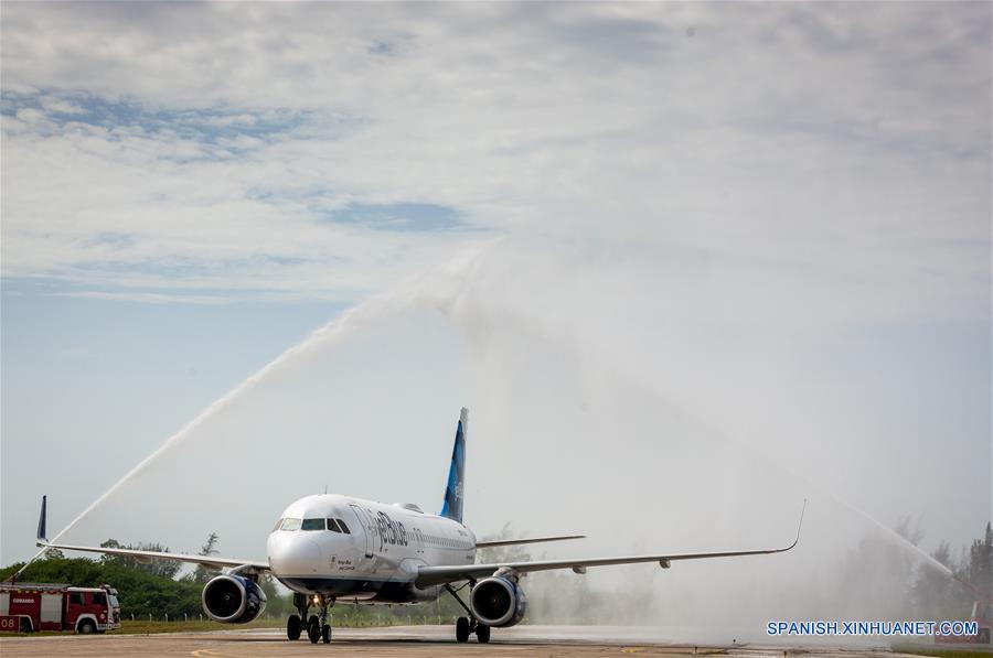 El primer vuelo regular entre Cuba y Estados Unidos de América en 55 a?os recibe el saludo de agua a su llegada al Aeropuerto Internacional Abel Santamaría, en Santa Clara, provincia de Villa Clara, Cuba, el 31 de agosto de 2016. El Airbus A320 de la compa?ía estadounidense JetBlue tocó pista el miércoles a las 10:57 tiempo local (14:57 GMT) en el aeropuerto internacional Abel Santamaría de la ciudad cubana de Santa Clara en la provincia de Villa Clara (centro). La llegada de la aeronave procedente de Fort Lauderdale (Florida), inauguró formalmente los vuelos regulares directos entre Cuba y Estados Unidos de América. (Xinhua/Liu Bin)