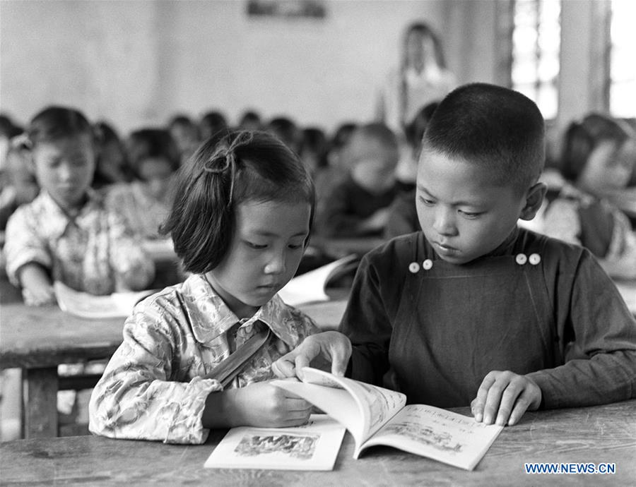 Sichuan,01/09/2016 (El Pueblo en Línea) - Foto de archivo del 1 de septiembre de 1956 muestra a los nuevos estudiantes Zhang Guifang (izquierda) y Zhang Dayun con los libros de lectura en su primer día de colegio en la escuela primaria Hexing del condado Pixian, provincia de Sichuan. (Xinhua / Sol Zhong Jing)