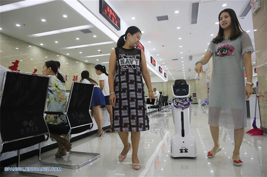 Dos residentes conversan junto al robot inteligente Baobao en el Centro de Servicios Administrativos del condado de Baofeng, ciudad de Pingdingshan, provincia de Henan, en el centro de China, el 2 de septiembre de 2016. Actuando como un gerente de recepción, Baobao puede hablar con las personas y responder preguntas acerca del servicio administrativo.