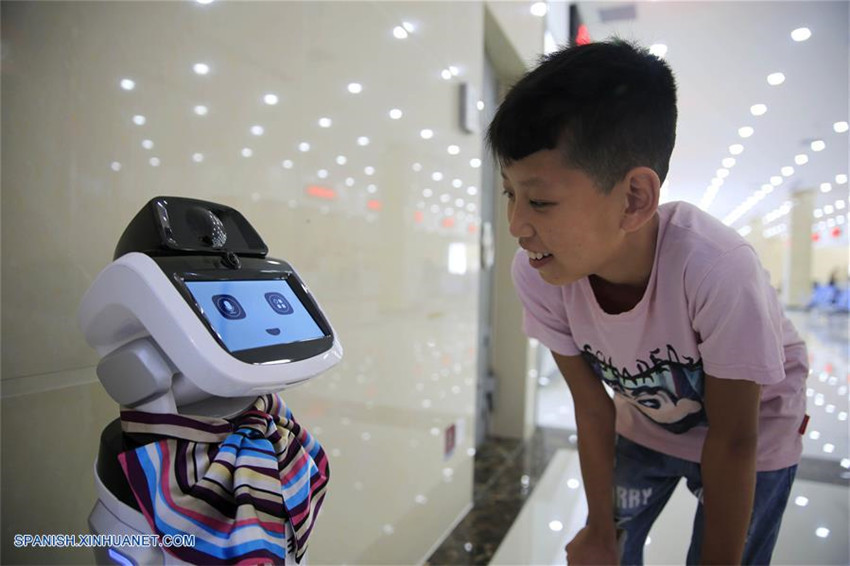 Un ni?o observa el robot inteligente Baobao en el Centro de Servicios Administrativos del condado de Baofeng, ciudad de Pingdingshan, provincia de Henan, en el centro de China, el 2 de septiembre de 2016. Actuando como un gerente de recepción, Baobao puede hablar con las personas y responder preguntas acerca del servicio administrativo.