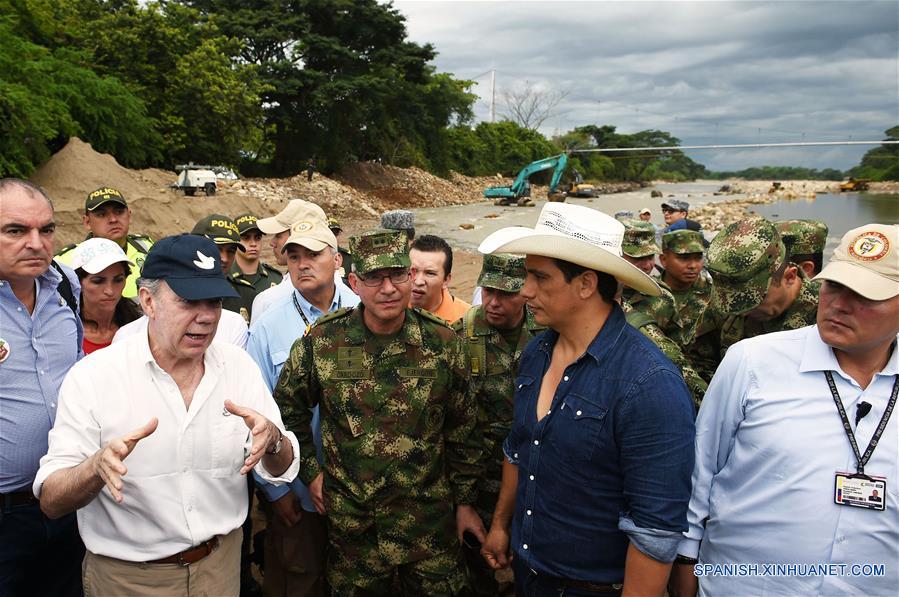 Imagen cedida por Presidencia de Colombia del presidente de Colombia, Juan Manuel Santos (2-i-frente), participando en una visita en el sitio donde cayó un puente en el departamento de Casanare, Colombia, el 4 de septiembre de 2016. De acuerdo con información de la prensa local, el presidente Juan Manuel Santos visitó Casanare el domingo para supervisar las obras que abren el paso por la carretera principal, luego de la caída del puente El Charte en días pasados, lo que ha dificultado el transporte de materias primas y petróleo en la zona. (Xinhua/Juan Pablo Bello/Presidencia de Colombia)