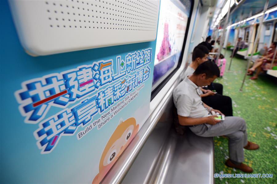NANNING, septiembre 5, 2016 (Xinhua) -- Pasajeros permanecen en un vagón del Metro decorado con pinturas temáticas de China y la Asociación de Naciones del Sudeste Asiático (ASEAN, por sus siglas en inglés) en Nanning, en la Región Autónoma Zhuang de Guangxi, en el sur de China, el 5 de septiembre de 2016. La 13 Exposición China-ASEAN se llevará a cabo del 11 al 14 de septiembre. (Xinhua/Wang Quanchao)