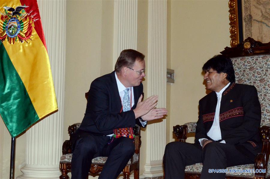 LA PAZ, septiembre 6, 2016 (Xinhua) -- El presidente de Bolivia, Evo Morales (d), recibe las cartas credenciales del embajador de Finlandia, Mika Kristian Koskinen (i), en el Palacio de Gobierno, en La Paz, Bolivia, el 6 de septiembre de 2016. Los nuevos embajadores de El Salvador, Noruega, Finlandia y Grecia presentaron el martes sus cartas credenciales al presidente boliviano, Evo Morales, en un acto protocolar llevado a cabo en el Palacio de Gobierno en La Paz, de acuerdo con información de la prensa local. (Xinhua/José Lirauze/ABI)