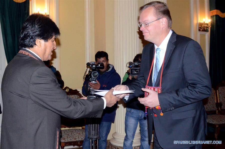 LA PAZ, septiembre 6, 2016 (Xinhua) -- El presidente de Bolivia, Evo Morales (i), recibe las cartas credenciales del embajador de Finlandia, Mika Kristian Koskinen (d), en el Palacio de Gobierno, en La Paz, Bolivia, el 6 de septiembre de 2016. Los nuevos embajadores de El Salvador, Noruega, Finlandia y Grecia presentaron el martes sus cartas credenciales al presidente boliviano, Evo Morales, en un acto protocolar llevado a cabo en el Palacio de Gobierno en La Paz, de acuerdo con información de la prensa local. (Xinhua/José Lirauze/ABI)