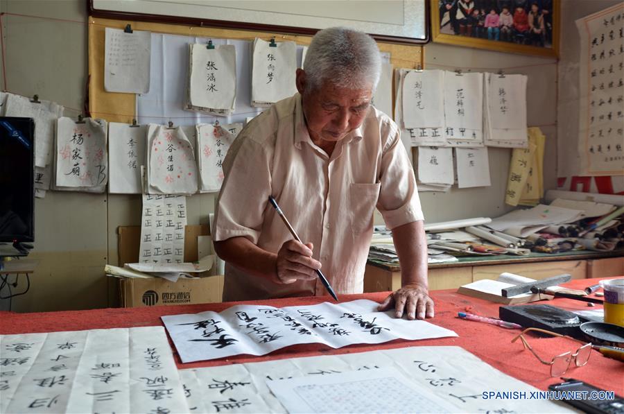 Imagen del 6 de septiembre de 2016 de Zhang Xing'en escribiendo caligrafía en su vivienda en la localidad de Xiguan, en el distrito de Gaocheng de Shijiazhuang, capital de la provincia de Hebei, en el norte de China. Zhang Xing'en, de 81 a?os de edad, ha estado ense?ando caligrafía voluntariamente a los estudiantes de la Escuela Primaria Xiguan en el distrito de Gaocheng por más de tres a?os para incrementar su sensibilidad estética para la caligrafía. (Zhang Jiangang)