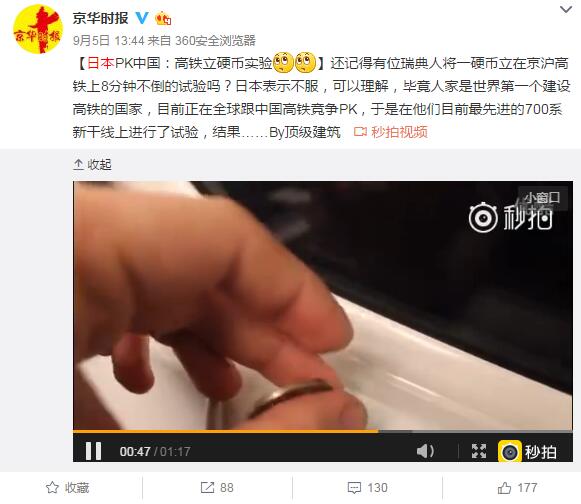 Beijing Times volvió a publicar en su cuenta oficial de Sina Weibo el 5 de septiembre el video que muestra el fracasado intento de equilibrar la moneda en un tren japonés de alta velocidad. [Foto: Weibo]