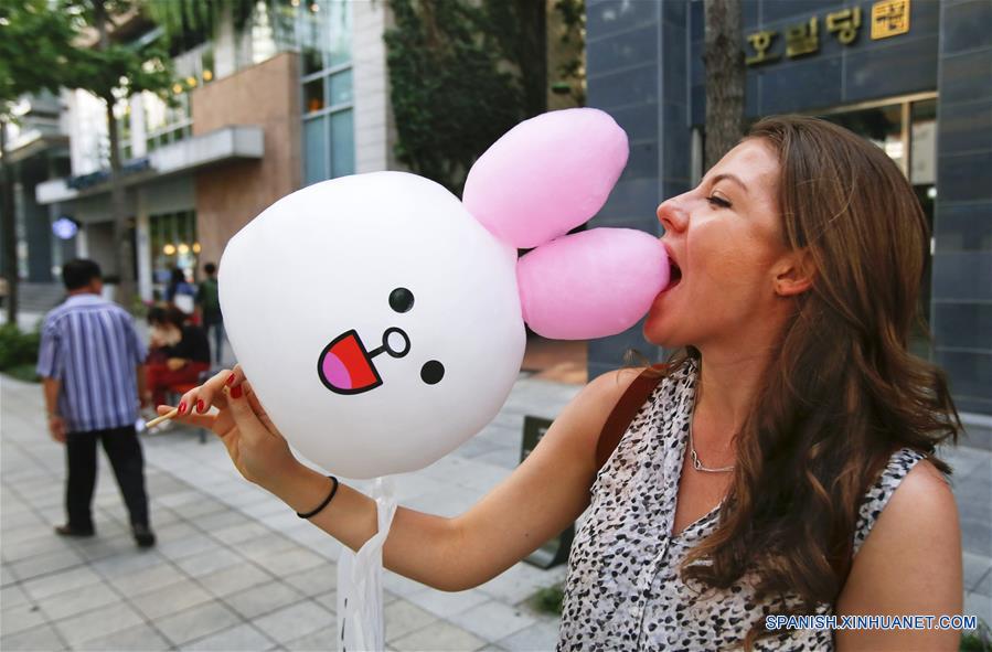 SEUL, septiembre 11, 2016 (Xinhua) -- Una mujer come un algodón de azúcar en forma de conejo en Seúl, capital de República de Corea, el 11 de septiembre de 2016. (Xinhua/Won-Ki Min/ZUMAPRESS)