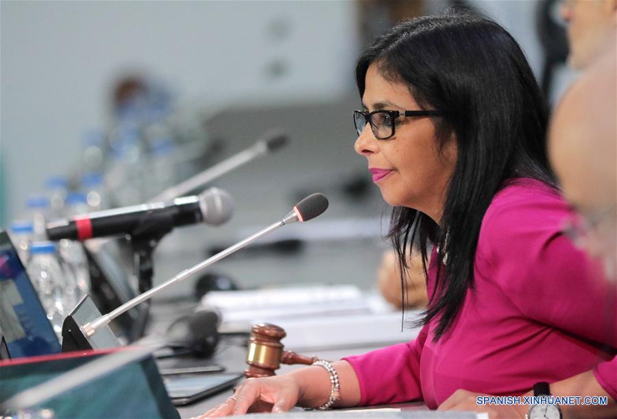 La ministra de Relaciones Exteriores de Venezuela, Delcy Rodríguez, pronuncia un discurso durante la plenaria de Cancilleres de la 17 Cumbre del Movimiento de países No Alineados (MNOAL), en la isla de Margarita, Venezuela, el 15 de septiembre de 2016. (Xinhua/Prensa Presidencial/AVN)