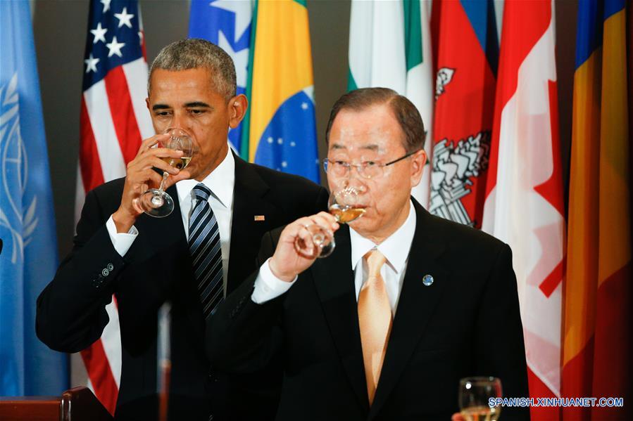 El presidente de Estados Unidos de América, Barack Obama (i), brinda con el secretario general de la Organización de las Naciones Unidas (ONU), Ban Ki-moon (d), durante un almuerzo de jefes de Estado organizado por Ban Ki-moon, en la sede de la ONU, en Nueva York, Estados Unidos de América, el 20 de septiembre de 2016. (Xinhua/Li Muzi)