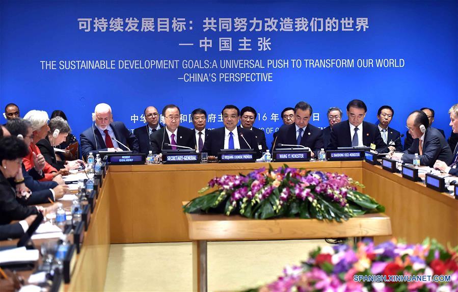 El primer ministro de China, Li Keqiang (c), preside una mesa redonda sobre los Objetivos de Desarrollo Sostenible (ODS), en la sede de la Organización de las Naciones Unidas (ONU), en Nueva York, Estados Unidos de América, el 19 de septiembre de 2016. (Xinhua/Li Tao)
