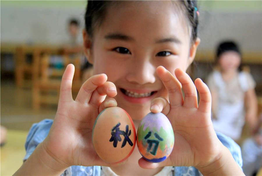 Una ni?a sostiene dos huevos en la ciudad de Lianyungang, provincia de Jiangsu. [Foto: Shao Shixin]