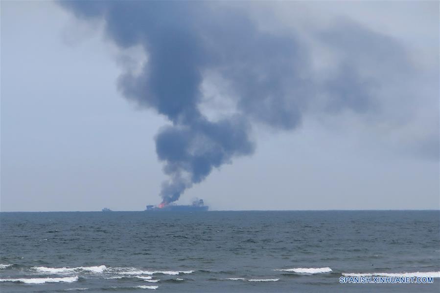 Una columna de humo emana del buque tanque "Burgos" de la empresa estatal Petróleos Mexicanos (PEMEX), durante un incendio frente a la costa del municipio de Boca del Río, estado de Veracruz, México, el 24 de septiembre de 2016. Un buque tanque que transportaba combustibles de la empresa PEMEX se incendió el sábado frente a las costas del estado de Veracruz, sin que se registraran heridos, informaron autoridades federales y estatales. PEMEX informó en su cuenta oficial de Twitter que el accidente en la embarcación "Burgos" ocurrió frente a las playas del municipio de Boca del Río, contiguo al puerto de Veracruz, en el golfo de México. El buque se encontraba a unos 9.6 kilómetros de la costa cuando a las 11:30 hora local se registró una explosión que causó el incendio, el cual generó una columna de humo negro de decenas de metros de altura, según los reportes de la Administración Portuaria Integral (API) de Veracruz y de la Secretaría de Protección Civil estatal. De acuerdo con reportes de la prensa local, el buque tanque transportaba 80,000 barriles de diésel, 71,000 de gasolina Magna (87 octanos) y 16,000 de gasolina desulfurada, aunque el dato no ha sido confirmado oficialmente por las autoridades. (Xinhua/Str)
