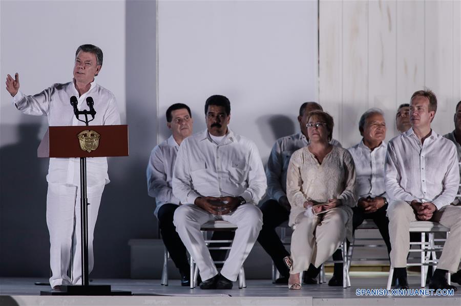 Los presidentes de Bolivia, Evo Morales; de Cuba, Raúl Castro; de El Salvador, Salvador Sánchez; de Guatemala, Jimmy Morales; de Perú, Pedro Pablo Kuczynski; de Chile, Michelle Bachelet; de México, Enrique Pe?a Nieto; de Ecuador, Rafael Correa; de República Dominicana, Danilo Santos; de Paraguay, Horacio Cartes, y Venezuela, Nicolás Maduro, que han llegado para ser testigos de este momento histórico.