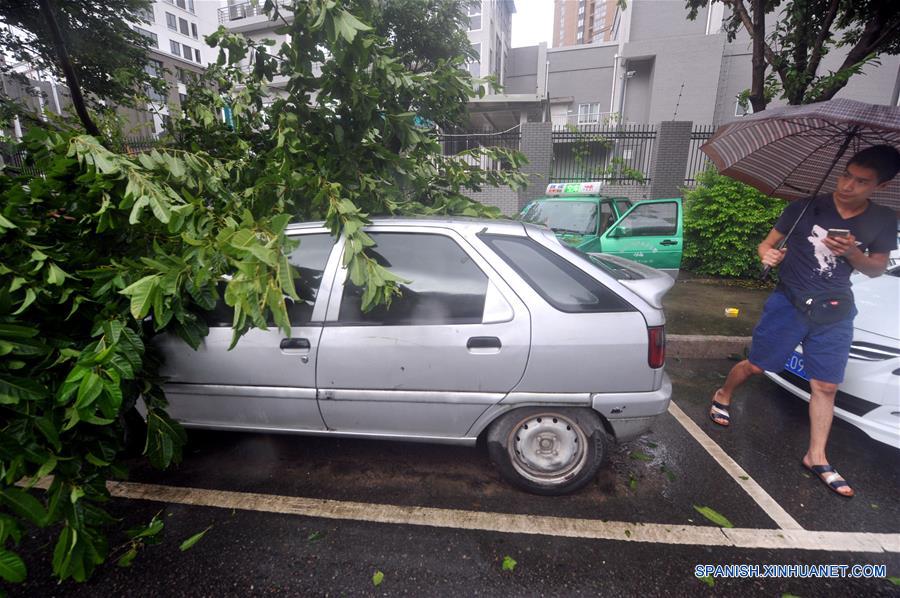 Restos de un árbol permanece sobre un vehículo en Fuzhou, capital de la provincia de Fujian, en el sureste de China, el 28 de septiembre de 2016. El tifón "Megi" tocó tierra a las 04:40 hora local del miércoles en Hui'an, ciudad de Quanzhou, en la provincia china oriental de Fujian, con vientos de hasta 118,8 kilómetros por hora, informaron las autoridades meteorológicas. "Megi", el 17 tifón de este a?o, mató cuatro personas y dejó 268 heridos en Taiwan, en el sureste de China cuando el martes atravesó la isla. (Xinhua/Peng Zhangqing)