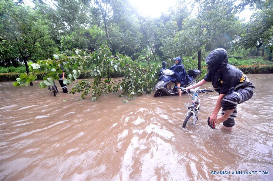 Personas intentan cruzar un camino inundado en Fuzhou, capital de la provincia de Fujian, en el sureste de China, el 28 de septiembre de 2016. El tifón "Megi" tocó tierra a las 04:40 hora local del miércoles en Hui'an, ciudad de Quanzhou, en la provincia china oriental de Fujian, con vientos de hasta 118,8 kilómetros por hora, informaron las autoridades meteorológicas. "Megi", el 17 tifón de este a?o, mató cuatro personas y dejó 268 heridos en Taiwan, en el sureste de China cuando el martes atravesó la isla. (Xinhua/Peng Zhangqing)