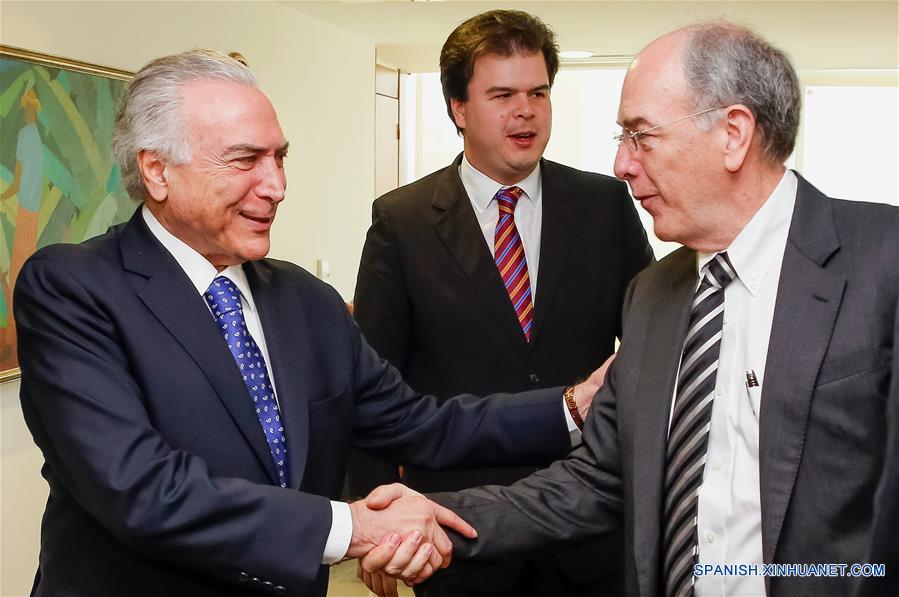 BRASILIA, septiembre 27, 2016 (Xinhua) -- Imagen cedida por la Presidencia de Brasil del presidente brasile?o Michel Temer (i) y el presidente de PETROBRAS, Pedro Parente (d), estrechando sus manos durante una reunión en Brasilia, capital de Brasil, el 27 de septiembre de 2016. Pedro Parente, defendió el martes el fin de la ley que obliga a la compa?ía a explorar todos los campos de petróleo en el área del presal, donde hay grandes reservas de hidrocarburos. Parente se reunió el martes con Michel Temer, y le presentó el plan de negocios de la compa?ía para los próximos cinco a?os. (Xinhua/Marcos Correa/Presidencia de Brasil)