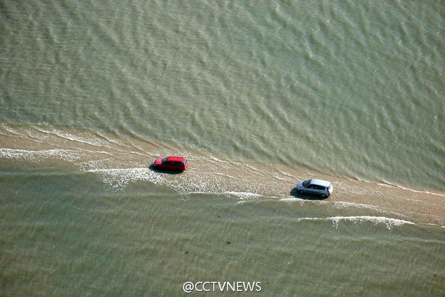 Francia,28/09/2016 (El Pueblo en Línea) - Aquellos que quieran utilizar la carretera francesa Du Gois que enlaza el golfo Burnёf y la isla Noirmoutier, solamente tienen dos oportunidades para atravesarla. Debido a la marea, la carretera se sumerge en el mar. [Foto: Weibo de CCTVNEWS]