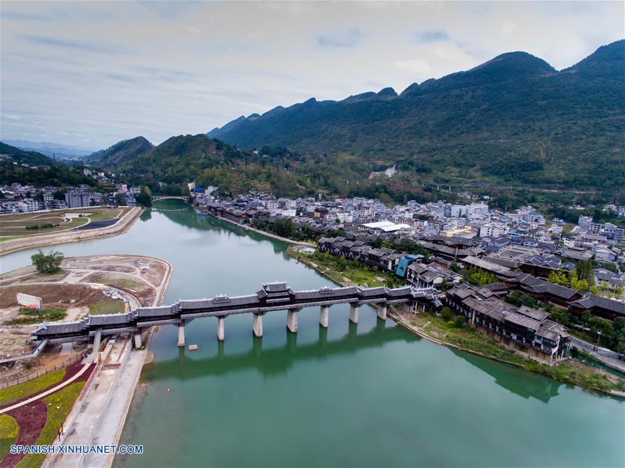 CHONGQING, septiembre 30, 2016 (Xinhua) -- Imagen del 29 de septiembre de 2016 del puente cubierto que cruza el río Apeng, en Chongqing, en el suroeste de China. La construcción de madera anterior que cubría el puente fue destruida por un incendio en el 2013, y el puente fue reabierto un a?o después luego de su reconstrucción. (Xinhua/Liu Chan)