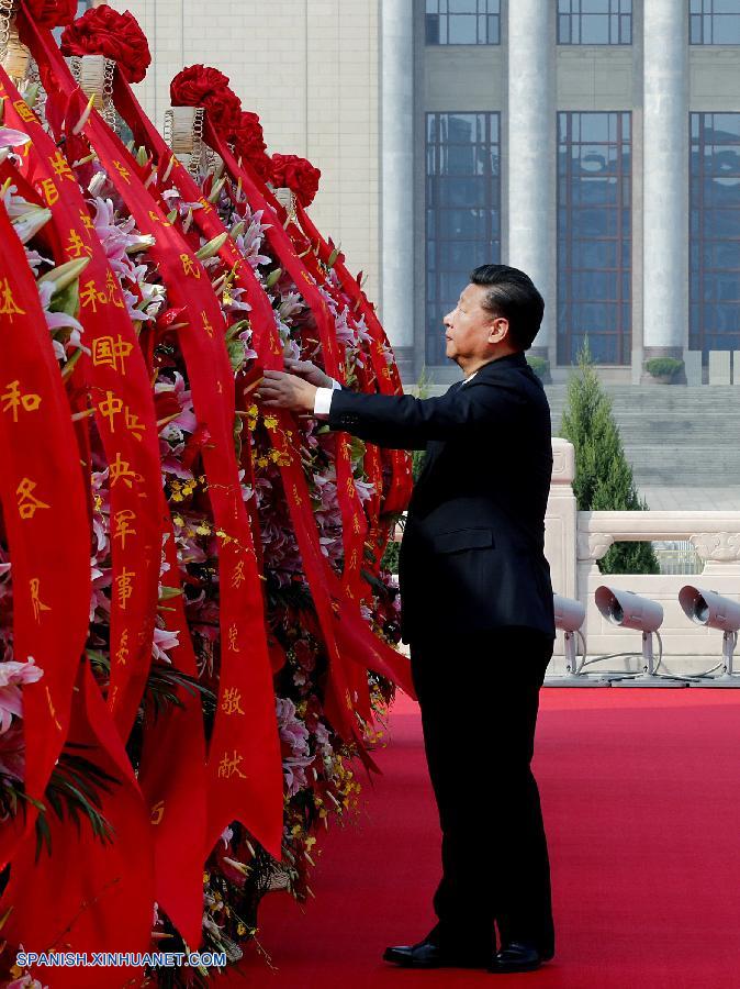 El presidente de China, Xi Jinping, organiza las cintas rojas sobre una ofrenda floral durante una ceremonia en la plaza Tian'anmen en Beijing, capital de China, el 30 de septiembre de 2016. El presidente chino, Xi Jinping, y otros altos líderes, incluidos Li Keqiang, Zhang Dejiang, Yu Zhengsheng, Liu Yunshan, Wang Qishan y Zhang Gaoli, asistieron a una ceremonia el viernes en la plaza Tian'anmen para honrar y conmemorar a los difuntos héroes nacionales en el Día de los Mártires. (Xinhua/Ju Peng)