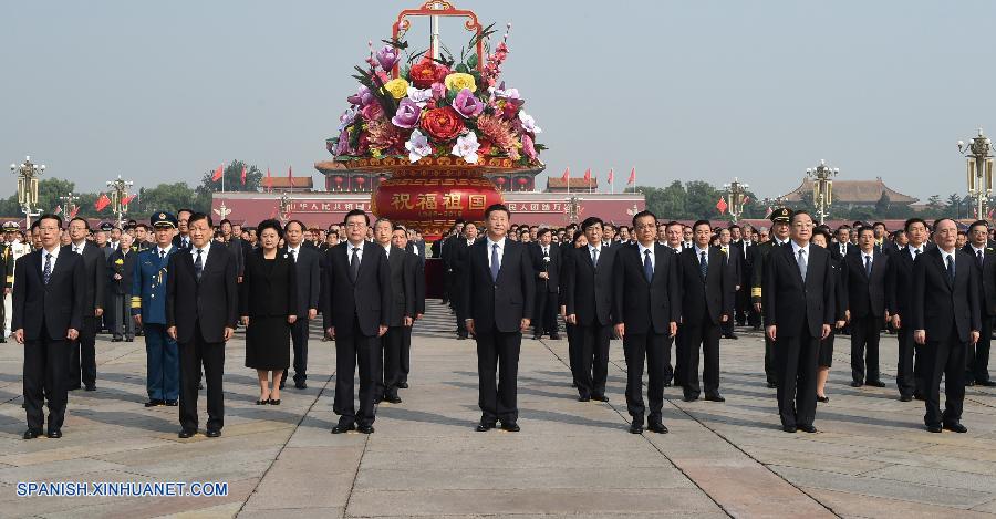 El presidente de China, Xi Jinping (c-frente), y otros altos líderes Li Keqiang (3-d-frente), Zhang Dejiang (3-i-frente), Yu Zhengsheng (2-d-frente), Liu Yunshan (2-i-frente), Wang Qishan (d-frente) y Zhang Gaoli (i-frente), asisten a una ceremonia para honrar y conmemorar a los difuntos héroes nacionales en el Día de los Mártires, en la plaza Tian'anmen en Beijing, capital de China, el 30 de septiembre de 2016. (Xinhua/Xie Huanchi)