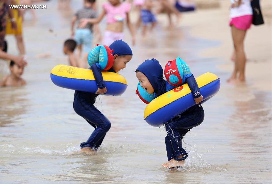 Los ni?os juegan en una playa de Sanya, provincia de Hainan, el 2 de octubre de 2016. En total, 593 millones de personas visitaron los lugares turísticos de todo el país y gastaron 482,2 millones de yuanes (72,3 millones de dólares) durante la celebración del Día Nacional de este a?o, un 12,8% y el 14,4% más respectivamente respecto al a?o anterior, según la Administración Nacional de Turismo de China. [Foto / Xinhua]
