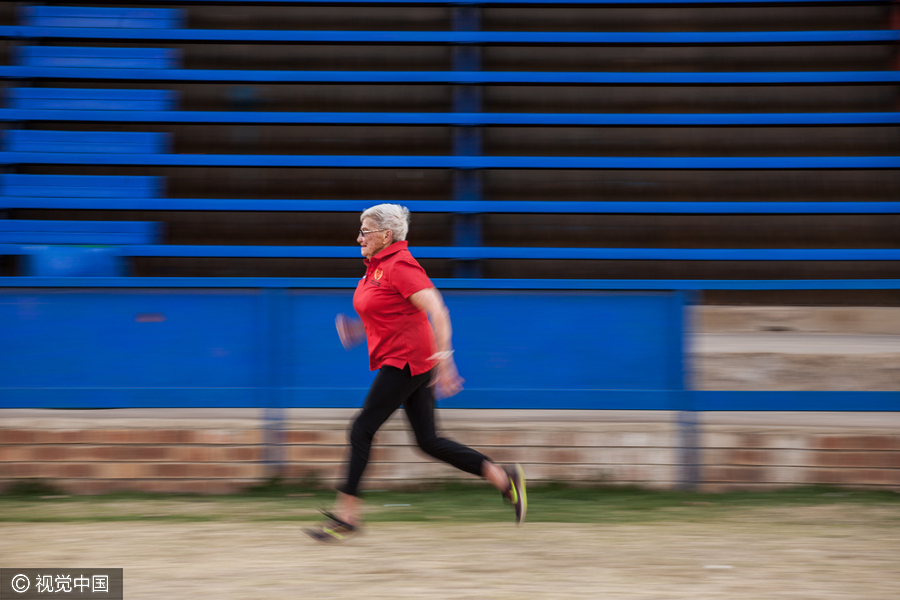 Con 85 a?os de edad, Christy Du Plooy se entrena en Benoni, Sudáfrica, el 8 de septiembre del 2016. [Foto: VCG]