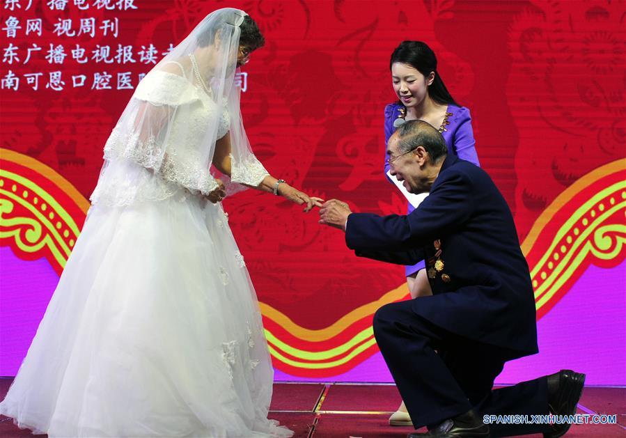 Guo Mingli (d), de 87 a?os de edad, le propone matrimonio a su esposa Wang Wenpei (i), de 83 a?os de edad, durante una ceremonia de "Bodas de Oro" en Jinan, capital de la provincia de Shandong, en el este de China, el 9 de octubre de 2016. Un total de 99 parejas de ancianos de Shandong, asistieron a una ceremonia colectiva de "Bodas de Oro", el domingo para festejar 50 a?os de matrimonio, en celebración del Festival Chongyang, el día de los ancianos de China. (Xinhua/Zhu Zheng)