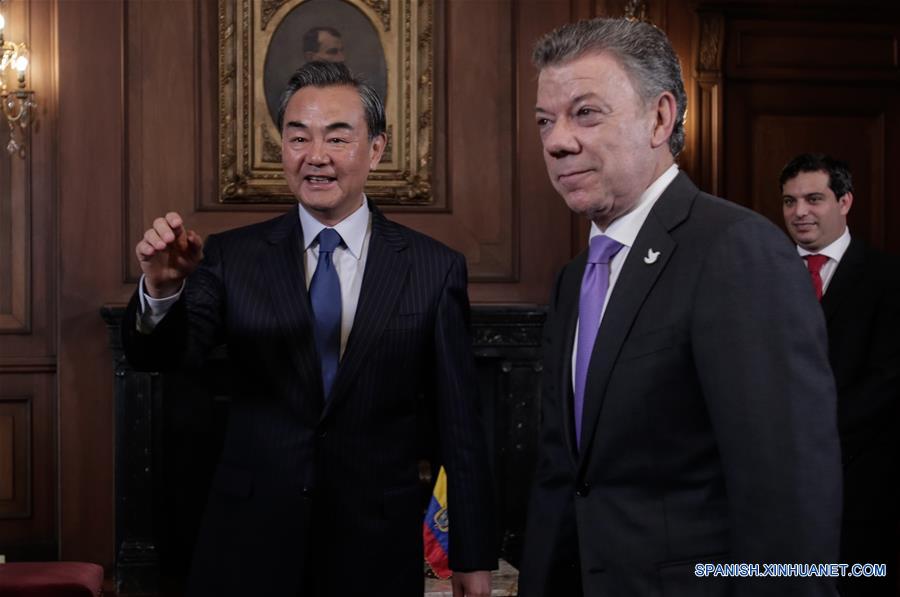 BOGOTA, octubre 9, 2016 (Xinhua) -- El presidente colombiano Juan Manuel Santos (d-frente) se reúne con el ministro de Relaciones Exteriores de China Wang Yi (i) en Bogotá, Colombia, el 7 de octubre de 2016. (Xinhua/Jhon Paz)