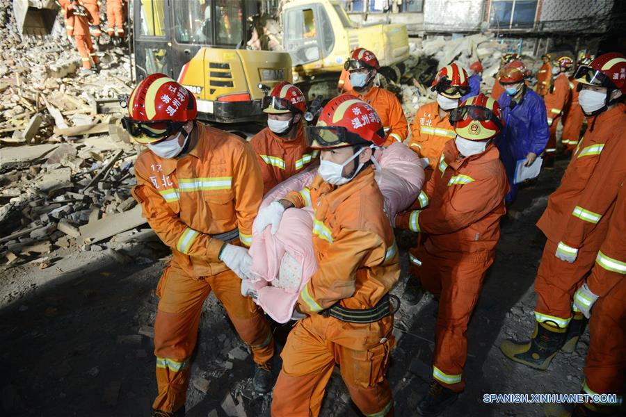 Rescatistas trasladan el cuerpo de una víctima en el sitio de un accidente en el distrito industrial Lucheng en la Ciudad de Wenzhou, en la provincia de Zhejiang, en el este de China, el 10 de octubre de 2016. Un total de 22 personas ha fallecido en el derrumbe de varios edificios residenciales ocurrido en la ma?ana del lunes en el distrito industrial de Lucheng de la ciudad de Wenzhou. (Xinhua/Str)