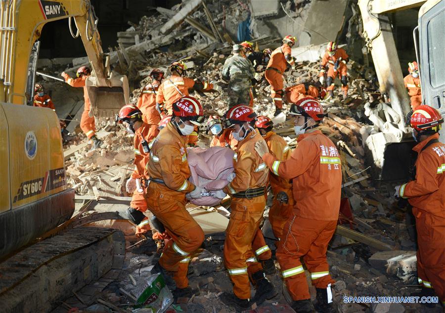 Rescatistas cargan el cuerpo de una víctima en el sitio de un accidente en el distrito industrial Lucheng en la Ciudad de Wenzhou, en la provincia de Zhejiang, en el este de China, el 10 de octubre de 2016. Un total de 22 personas ha fallecido en el derrumbe de varios edificios residenciales ocurrido en la ma?ana del lunes en el distrito industrial de Lucheng de la ciudad de Wenzhou. (Xinhua/Str)