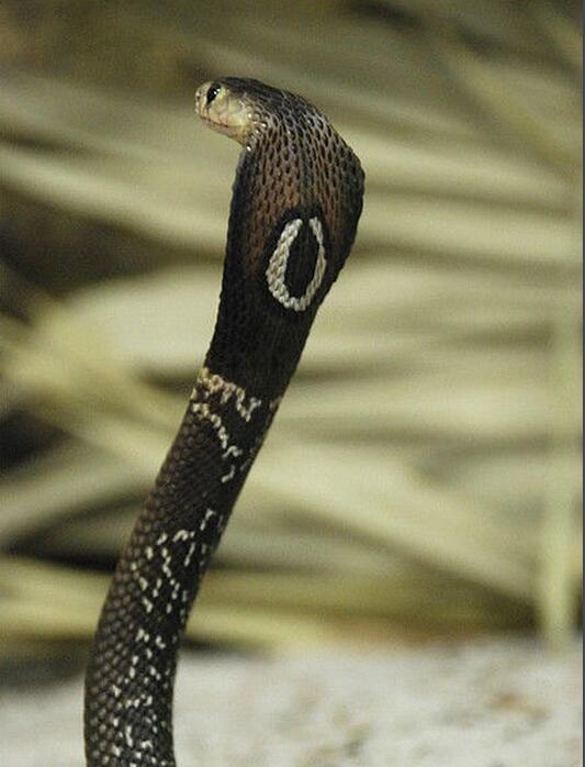 Las cobras pueden ser identificadas por el círculo que llevan en la piel de la parte trasera. Las serpientes adultas pueden llegar a medir hasta 1,5 metros y son muy venenosas. Una picadura produce un dolor intenso e hinchazón alrededor de la herida, y puede ser mortal.