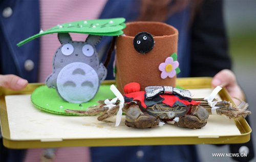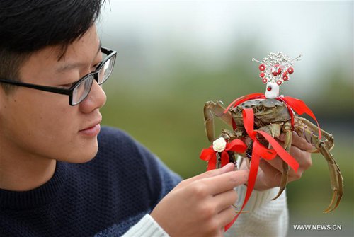 Jiangsu,12/10/2016 (El Pueblo en Línea) - Un cangrejo mitón chino decorado durante un desfile de moda de cangrejos en el lago Hongze de Huai'an, provincia de Jiangsu, el 11 de octubre de 2016. El festival de cosecha del cangrejo mitón chino del lago Hongze se celebró este martes 11 de octubre de 2016. (Xinhua / Zhou Hongming)