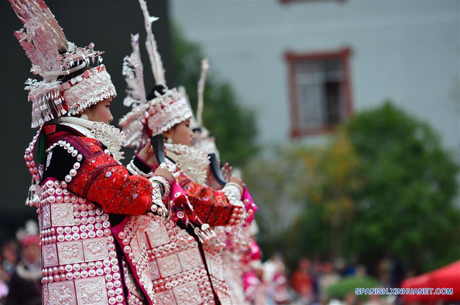 Artistas presentan trajes tradicionales del grupo étnico Miao, en el condado de Jianhe, provincia de Guizhou, en el suroeste de China, el 12 de octubre de 2016. Los equipos de 15 municipios bajo el condado de Jianhe participaron en el espectáculo para presentar trajes tradicionales. (Xinhua/Yang Wenbin)