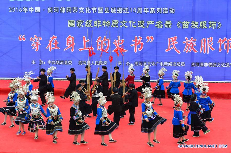 Artistas presentan trajes tradicionales del grupo étnico Miao, en el condado de Jianhe, provincia de Guizhou, en el suroeste de China, el 12 de octubre de 2016. Los equipos de 15 municipios bajo el condado de Jianhe participaron en el espectáculo para presentar trajes tradicionales. (Xinhua/Yang Wenbin)
