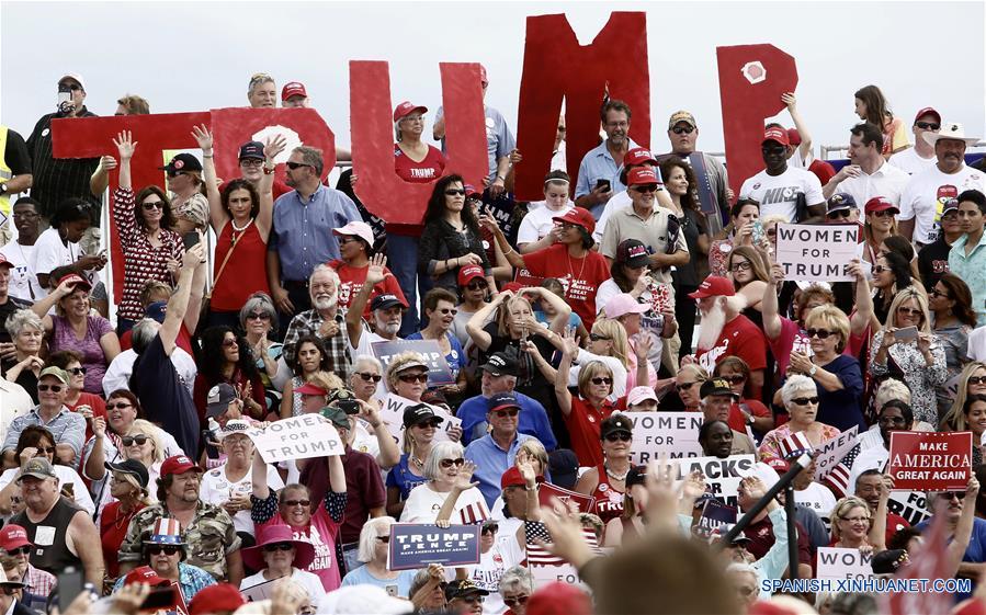 Simpatizantes del candidato del Partido Republicano a la presidencia de Estados Unidos de América, Donald Trump, reaccionan durante un evento de campa?a en el aeropuerto regional Linder de Lakeland, estado de Florida, Estados Unidos de América, el 12 de octubre de 2016. (Xinhua/Cherie Diez/Tampa Bay Times/ZUMAPRESS)
