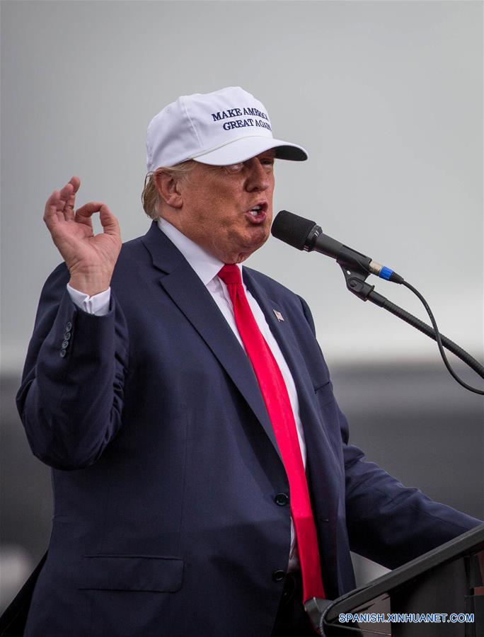 Simpatizantes del candidato del Partido Republicano a la presidencia de Estados Unidos de América, Donald Trump, reaccionan durante un evento de campa?a en el aeropuerto regional Linder de Lakeland, estado de Florida, Estados Unidos de América, el 12 de octubre de 2016. (Xinhua/Loren Elliott/Tampa Bay Times/ZUMAPRESS)
