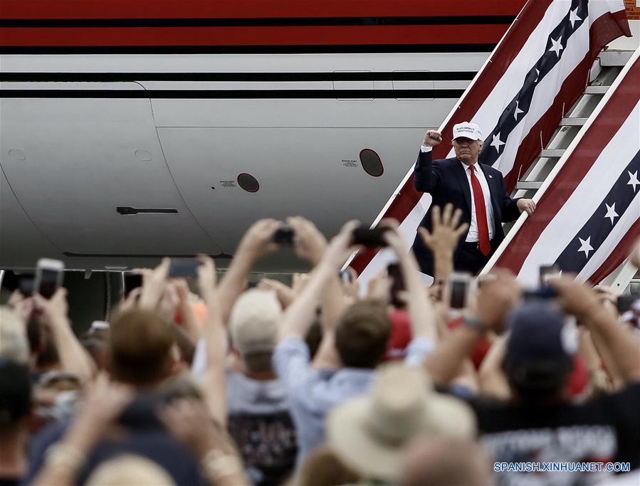 Simpatizantes del candidato del Partido Republicano a la presidencia de Estados Unidos de América, Donald Trump, reaccionan durante un evento de campa?a en el aeropuerto regional Linder de Lakeland, estado de Florida, Estados Unidos de América, el 12 de octubre de 2016. (Xinhua/Loren Elliott/Tampa Bay Times/ZUMAPRESS)