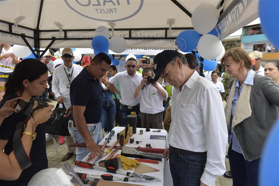 NARI?O, octubre 15, 2016 (Xinhua) -- Imagen cedida por la Presidecia de Colombia, del presidente colombiano, Juan Manuel Santos (2-d), revisando las herramientas usadas por la organización civil The Halo Trust para desactivación, de minas antipersonal durante la ceremonia de declaración de los municipios antioque?os de Nari?o, La Unión y Guatapé, libres de sospecha de contaminación de minas antipersonal y municiones sin explotar, en el municipio de Nari?o, departamento de Antioquia, Colombia, el 15 de octubre de 2016. El presidente colombiano, Juan Manuel Santos, declaró libres de minas los municipios de Nari?o, La Unión y Guatapé del departamento de Antioquia, el sábado durante la ceremonia. Juan Manuel Santos apreció el acto simbólico en el que ni?os de Nari?o representaron cómo el municipio se libera de la contaminación de minas antipersonal, de acuerdo con información de la prensa local. (Xinhua/Juan David Tena/Presidencia de Colombia)
