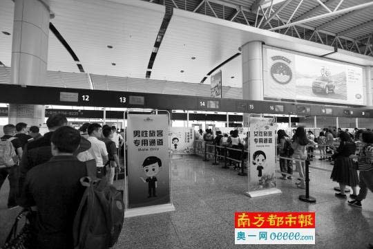 Guangzhou,17/10/2016 (El Pueblo en Línea) - Una foto sin fecha muestra el canal “sólo para hombres” en el control de seguridad del aeropuerto Baiyun de Guangzhou, sur de China [Foto: xkb.com.cn]. A partir de ahora, los hombres podrán disfrutar de este privilegio en el aeropuerto Baiyun de Guangzhou, ya que acaban de habilitarse canales especiales para los hombres en la zona de control de seguridad.