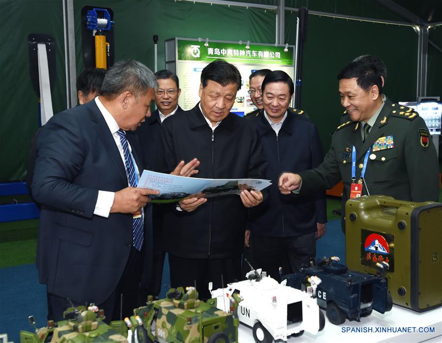 Liu Yunshan, un miembro del Comité Permanente del Buró Político del Partido Comunista de China Comité Central (CPC), visita a unaexposición sobre los resultados del proyecto de cooperación innovadora militar-civil en Beijing, capital de China, 19 de octubre de 2016.(Xinhua / Rao Aimin)