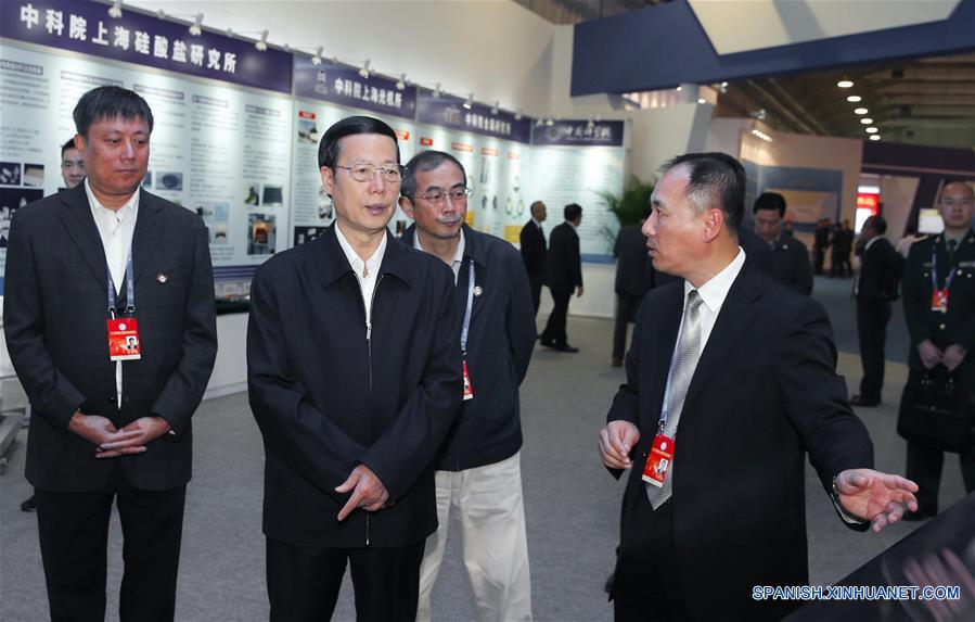 El viceprimer ministro chino Zhang Gaoli visita a una exposición sobre los resultados del proyecto de cooperación innovadora militar-civil en Beijing, capital de China, 19 de octubre de 2016.(Xinhua / Ju Peng)