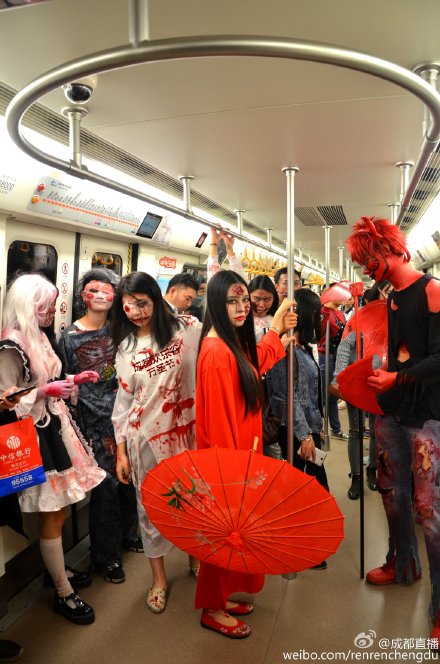 Chengdu,21/10/2016 (El Pueblo en Línea) - Con la llegada de Halloween, un grupo de jóvenes vestidos con disfraces terroríficos se subieron a un vagón de la línea 2 del metro de Chengdu. En poco tiempo, el metro de Chengdu publicó en su cuenta de Weibo que tal comportamiento no era ni civilizado ni normal, y que fácilmente podría asustar a los demás pasajeros.