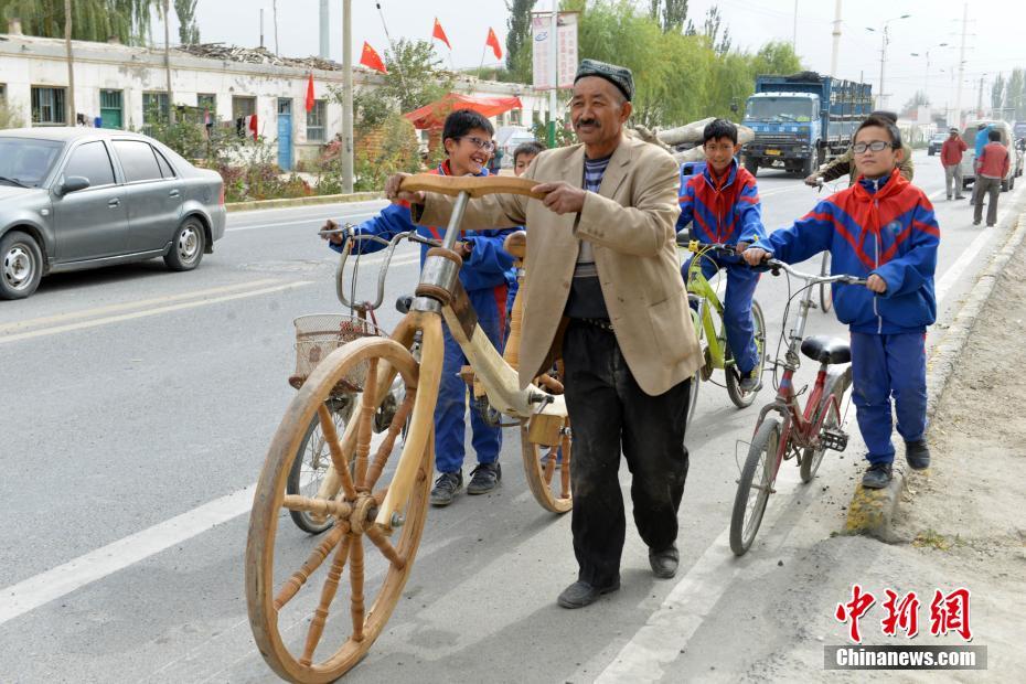 Xinjiang,24/10/2016 (El Pueblo en Línea) - Mamatta Sadi, un carpintero de 67 a?os con más de 50 de experiencia, natural del condado Avati en la región autónoma Uigur de Xinjiang, puso a prueba su experiencia creando una bicicleta de madera que ha llamado mucho la atención a los que pasan por delante de su taller. La bicicleta mide 2,8 metros de largo, 1,3 metros de altura, y excepto unas pocas piezas de metal, incluyendo más de 10 tornillos y engranajes, toda la bicicleta está hecha de madera. Sadi tardó más de un mes en finalizar la bicicleta, pero dice que aún no la ha terminado por completo. Tiene la intención de a?adir una campana, neumáticos de goma más adecuados y algunas piezas de hierro para fortalecer la estructura. [Foto: Chinanews.com]