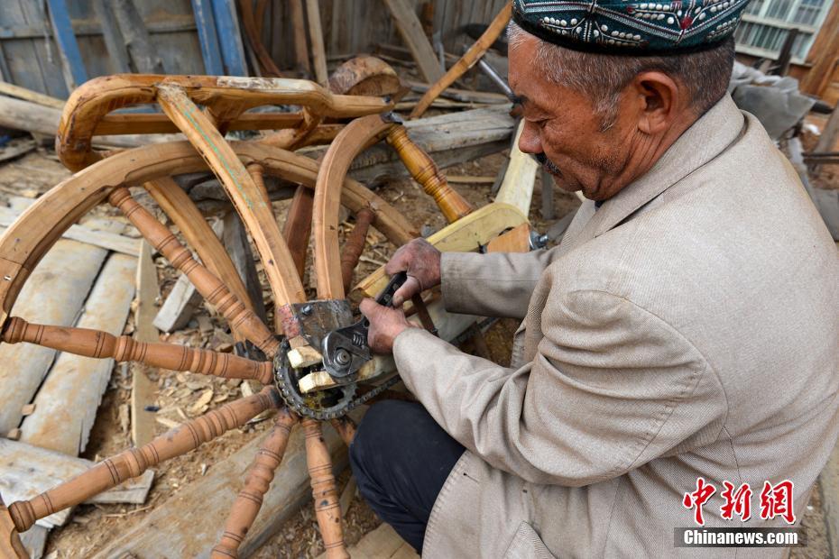 Xinjiang,24/10/2016 (El Pueblo en Línea) - Mamatta Sadi, un carpintero de 67 a?os con más de 50 de experiencia, natural del condado Avati en la región autónoma Uigur de Xinjiang, puso a prueba su experiencia creando una bicicleta de madera que ha llamado mucho la atención a los que pasan por delante de su taller. La bicicleta mide 2,8 metros de largo, 1,3 metros de altura, y excepto unas pocas piezas de metal, incluyendo más de 10 tornillos y engranajes, toda la bicicleta está hecha de madera. Sadi tardó más de un mes en finalizar la bicicleta, pero dice que aún no la ha terminado por completo. Tiene la intención de a?adir una campana, neumáticos de goma más adecuados y algunas piezas de hierro para fortalecer la estructura. [Foto: Chinanews.com]