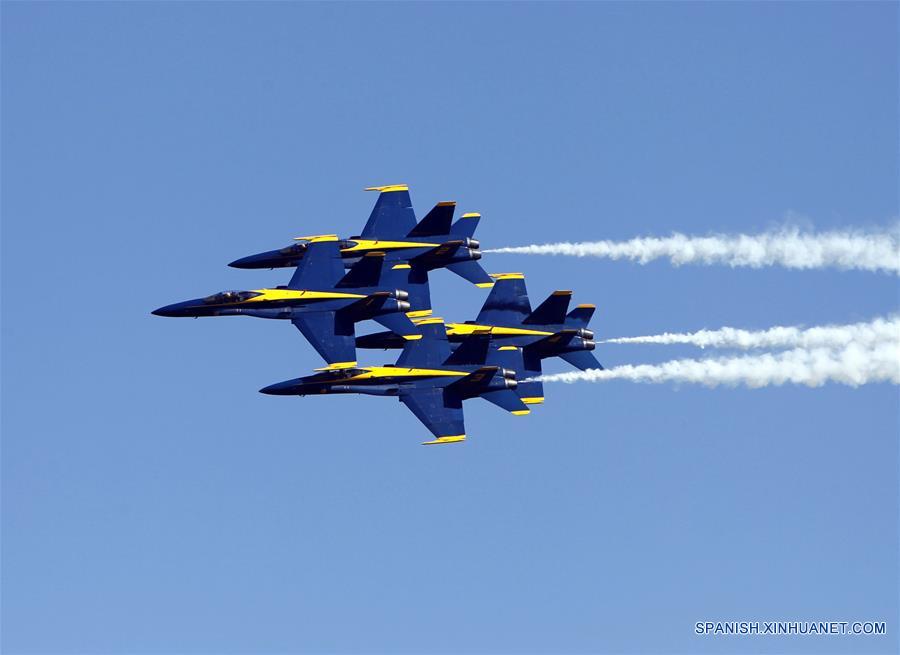 HOUSTON, octubre 23, 2016 (Xinhua) -- Miembros del equipo "Angeles Azules" de la marina estadounidense, realizan una formación durante el Espectáculo Aéreo de Houston, en el Aeropuerto de Ellington, en hosuton, Estados Unidos de América, el 22 de octubre de 2016. (Xinhua/Song Qiong)