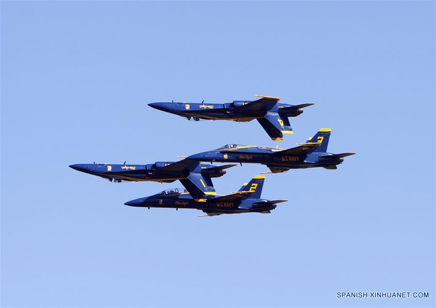 HOUSTON, octubre 23, 2016 (Xinhua) -- Miembros del equipo "Angeles Azules" de la marina estadounidense, realizan una formación durante el Espectáculo Aéreo de Houston, en el Aeropuerto de Ellington, en hosuton, Estados Unidos de América, el 22 de octubre de 2016. (Xinhua/Song Qiong)