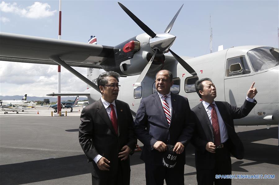 El presidente costarricense, Luis Guillermo Solís (c), el embajador de China en Costa Rica, Song Yanbin (i), y el vicepresidente ejecutivo de Aviation Industry Corporation of China, Zhang Guangjian (d), participan durante el acto de entrega de dos aviones tipo Y12E para Costa Rica de parte del gobierno de China, en la Dirección del Servicio de Vigilancia Aérea en el aeropuerto internacional Juan Santamaría en Alajuela, Costa Rica, el 24 de octubre de 2016. El presidente de Costa Rica, Luis Guillermo Solís, encabezó el lunes la ceremonia en la que su gobierno recibió dos aviones donados por China al Servicio de Vigilancia Aérea (SVA), para el combate al narcotráfico y atención de emergencias. Al recibir dos aeronaves a escala de manera simbólica, Solís agradeció al pueblo y al gobierno de China por su generosidad de contribuir a mejorar la seguridad y las capacidades del SVA con esta donación. (Xinhua/Kent Gilbert)
